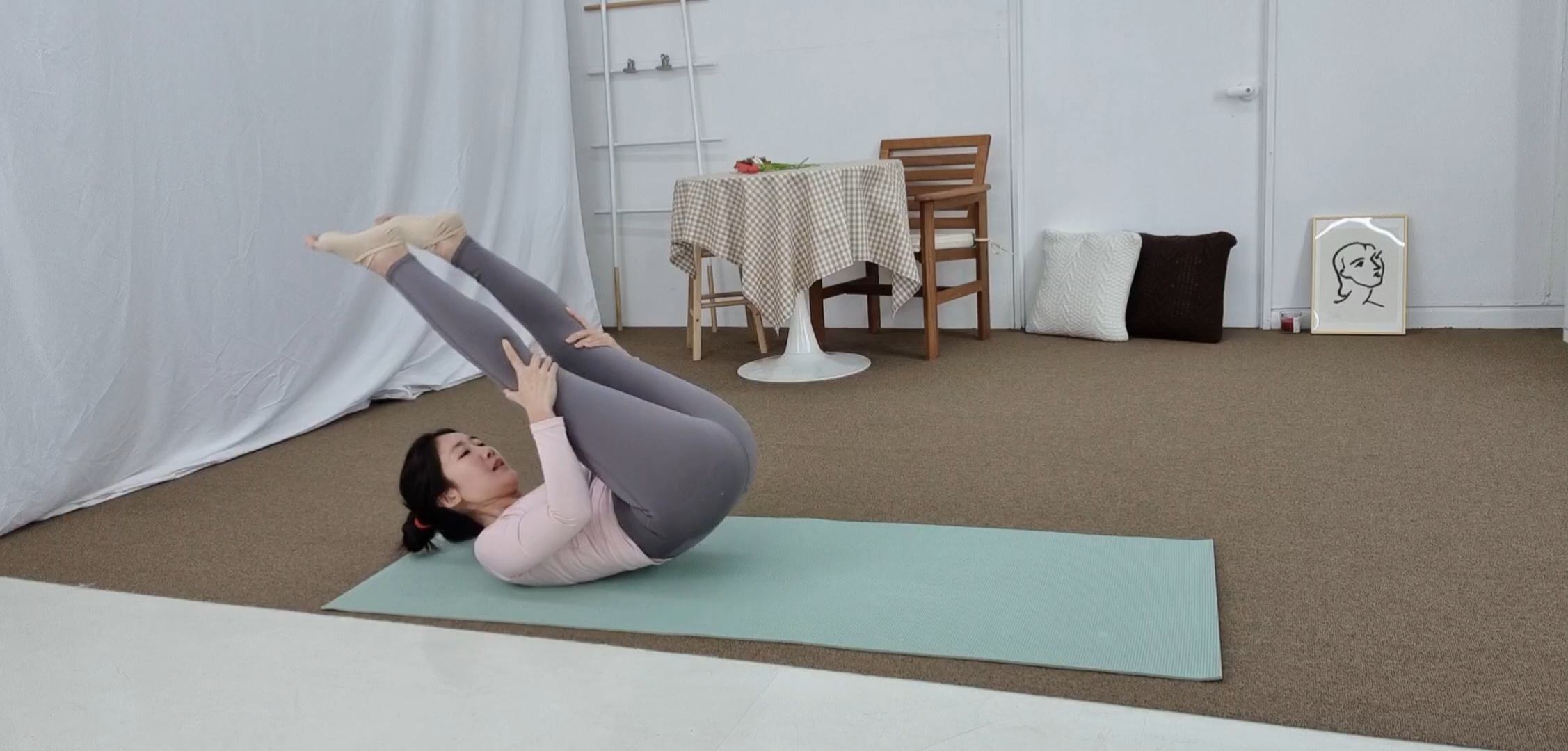 • 테이블 다리 지나. 시선 내리고. 배꼽 넣어요. 동그란 등. 무릎뒤로 손 넣어요. 상체뒤 넘겼다가 제자리 돌아옵니다.