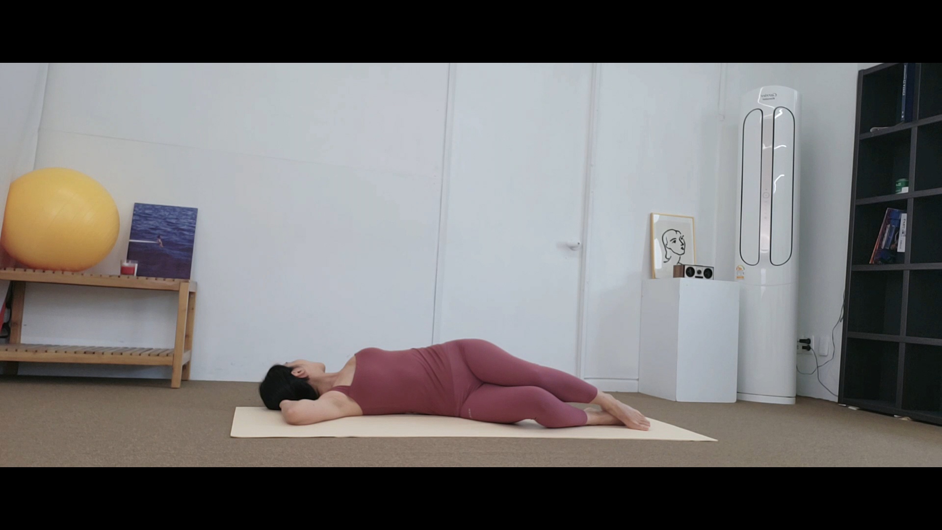 바로 연결해서 이어갑니다. 세워진 무릎을 옆으로 눕히면서 반대다리 뒤로 펴내 상체를 세워냅니다. 두골반 나란한 상태. 나의 다리를 잡거나 매트 위로 손끝을 세워내고, 코로 마시고 입으로 길게 뱉어내며 상체 길게 세워봅니다. 고관절과 복부 스트레칭 되고 있어요. 배뭉침 예방하는 동작이에요. 호흡 이어갑니다. 한골반 뜨지 않게 눌러줍니다. 천천히 풀어내고. 옆으로 시선을 돌려주고 뒷다리 잡아 끌어오세요. 시선 다시 정면 앞. 내뱉은 호흡마다 다리를 엉덩이 가깝게 당겨옵니다. 부어있던 다리까지 풀어주세요