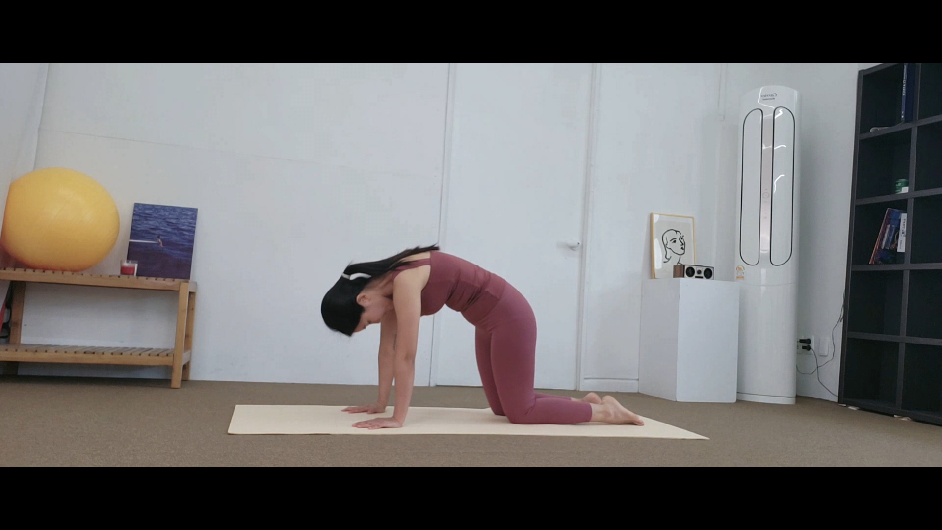 다시 시선 올리며 엉덩이 뿡, 오 목 한 등. 호흡하며 이어갑니다. 제법 큰 아기 때문에 앞으로 밀려있는 척추 통증 완화하고 부드럽고 유연하게 만들어줘요.