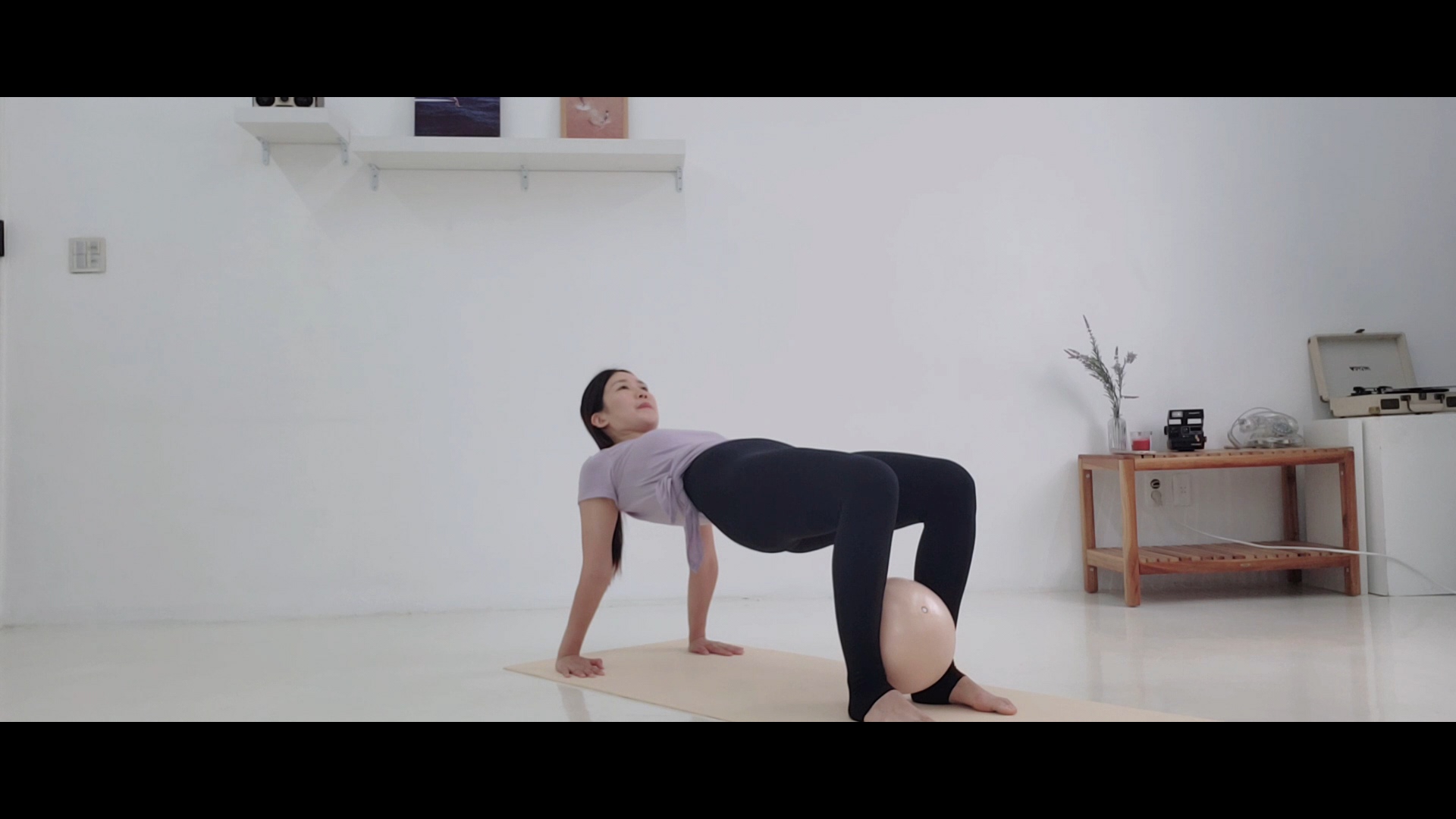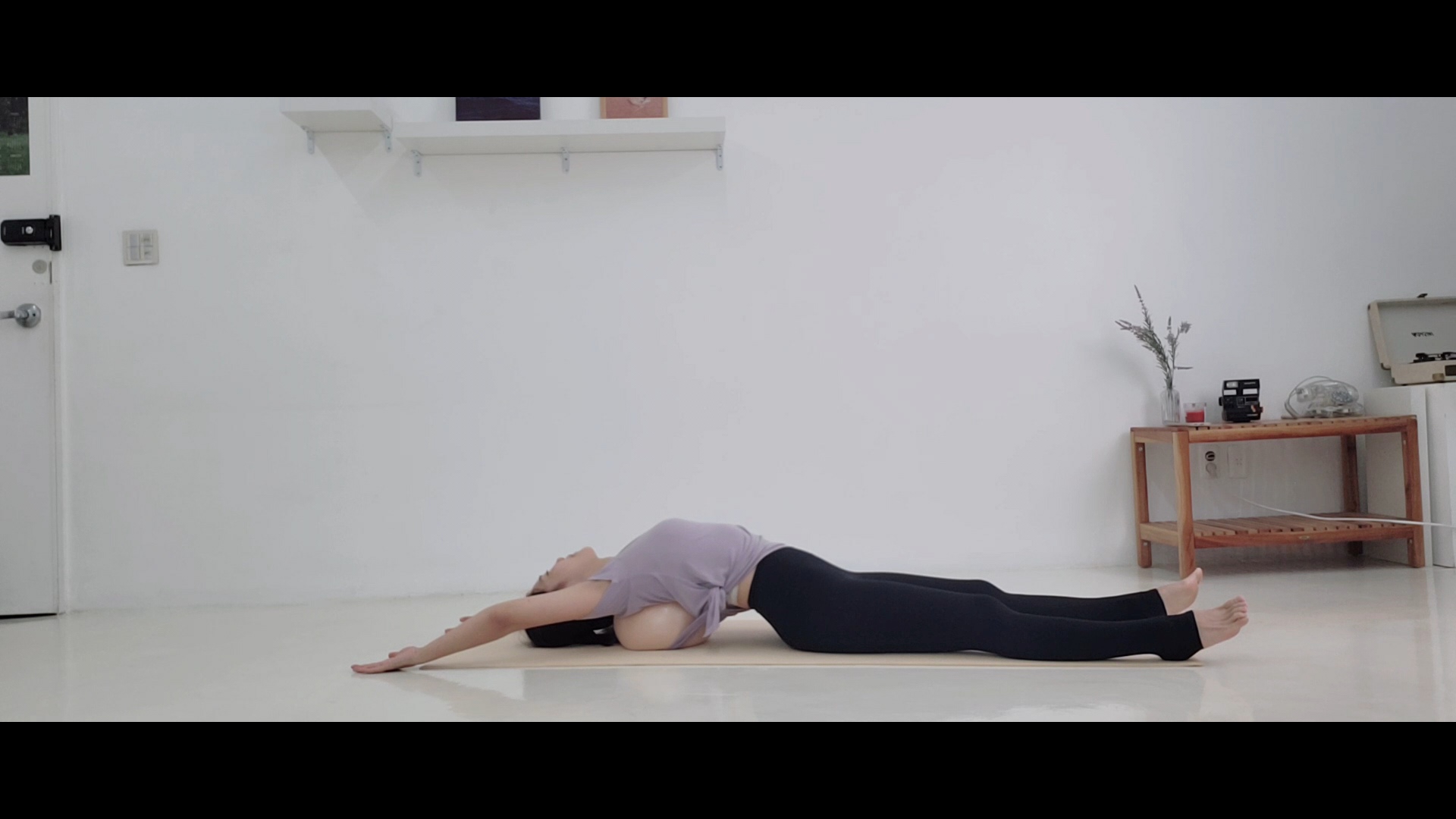상체를 움직이지 않은 채로, 마시는 숨 엉덩이뒤로 밀어 오목한 허리, 뱉는 숨. 골반 안으로 말아 올리며 판판한 허리 연결합니다.