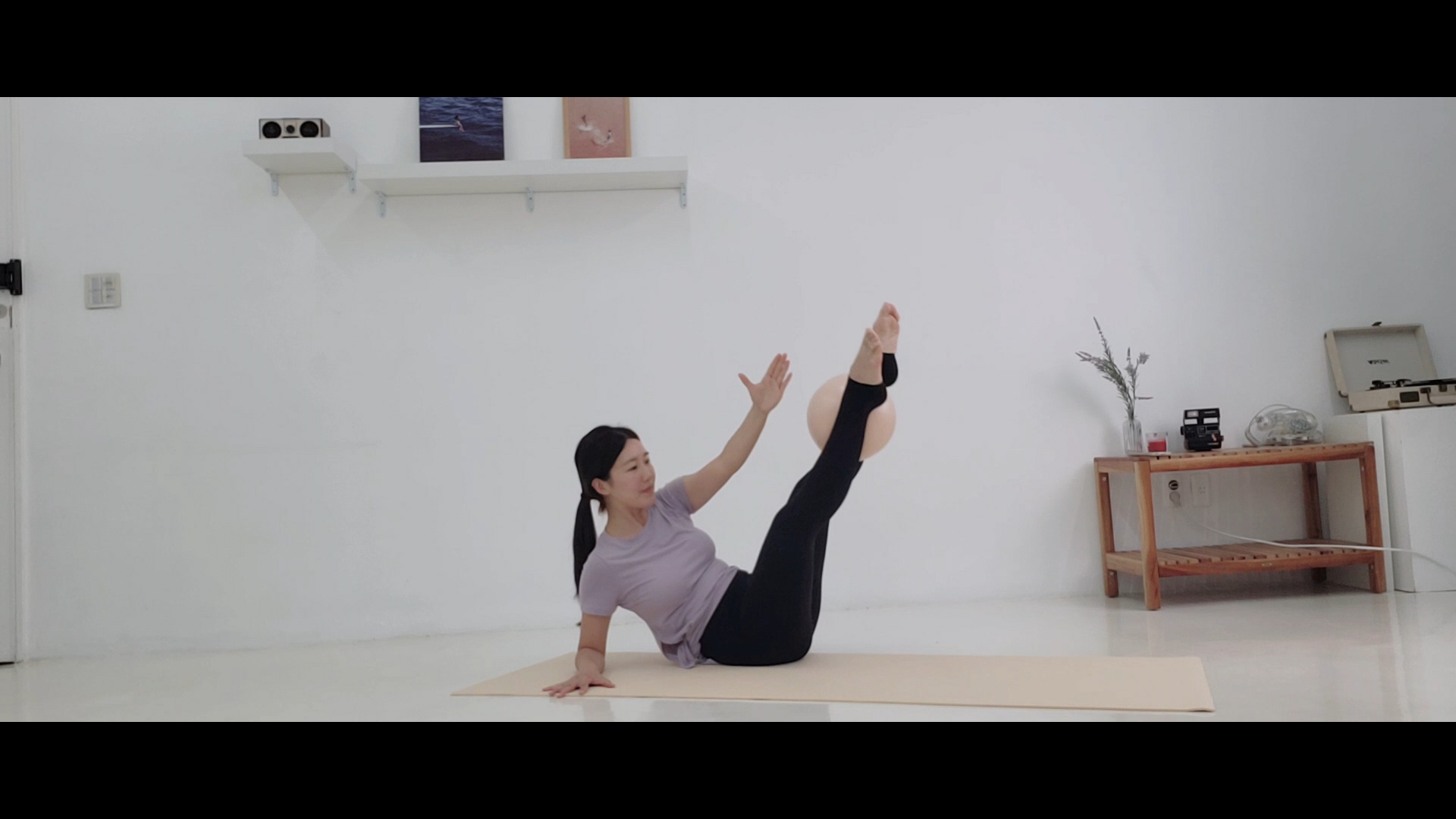 필라테스 소도구 미니볼 가지고 운동할 거예요. 미니볼 없으시다면 쿠션이나 베개도 좋습니다. 볼의 탄성을 이용해서 자극을 주고자 하는 부위에 좀 더 집중적인 운동효과 줄 수 있어요. 시작합니다.