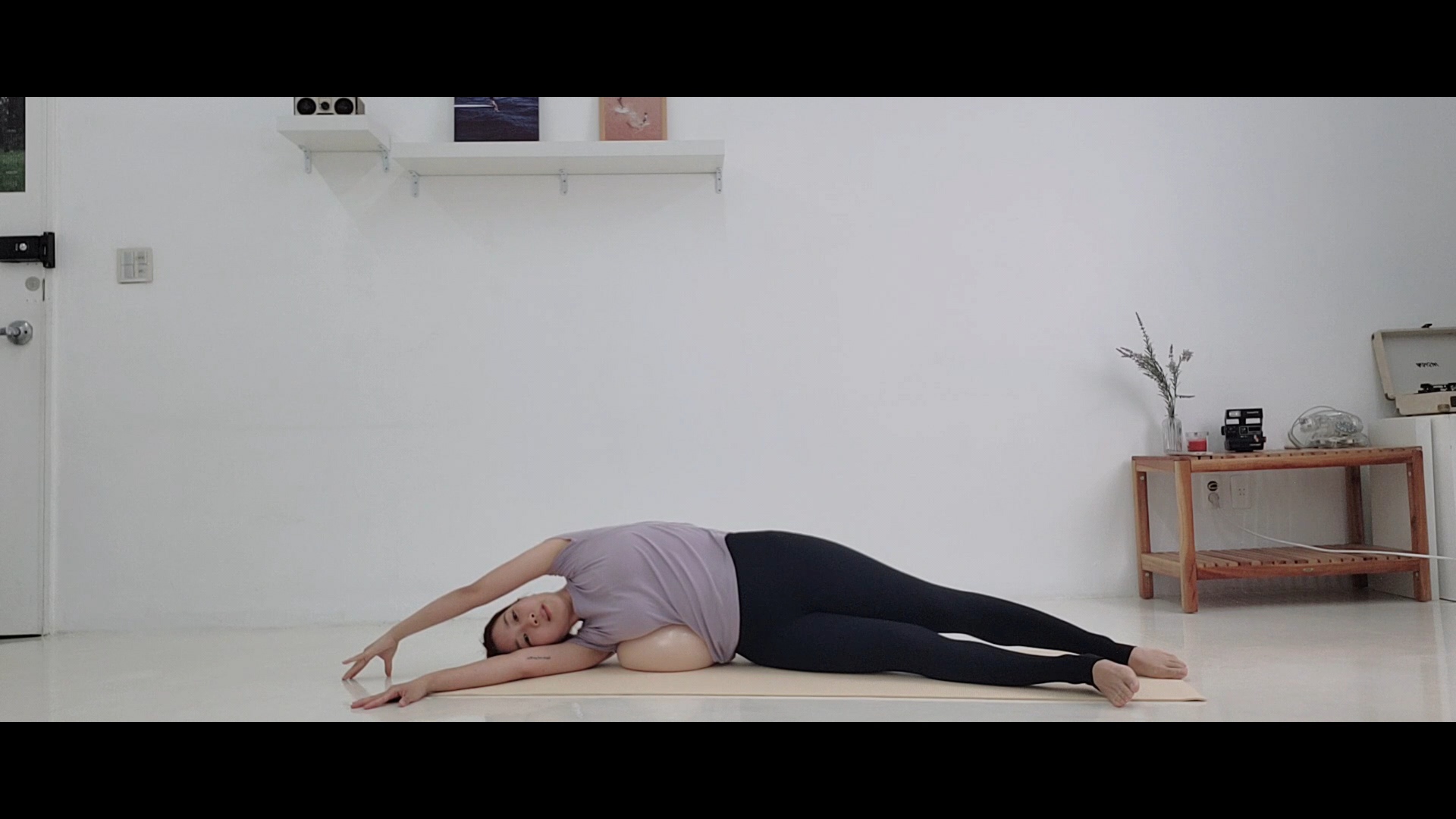 발목 안에 미니볼 끼우고, 옆으로 누워 준비합니다. 윗선 가슴 앞 짚어 중심. 두 다리 공중. 기다리고, 옆구리 단단합니다. 아랫다리 조여 올립니다. 힘든 느낌 들어요.