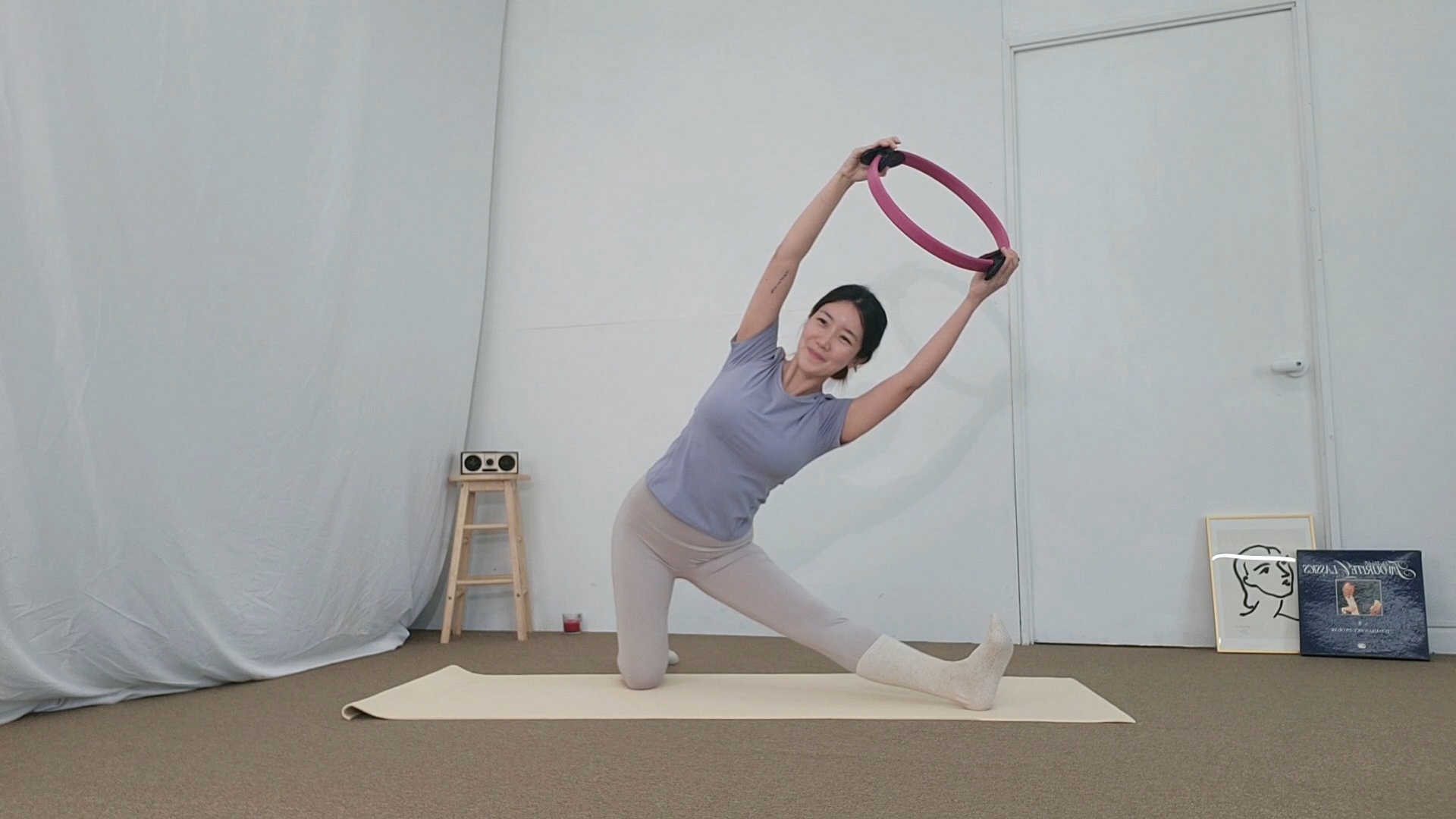 - 써클가지고,무릎지탱해서 상체 세워줍니다. 한 다리 사선 앞에. 골반 틀어지지 않게 맞추고. 발끝 들어 플랙스로 준비. 써클 잡아 위로 들고 상체 넘어옵니다. 복부힘 잡아야 허리 안 아파요. 서클 안에 머리 들어오고.