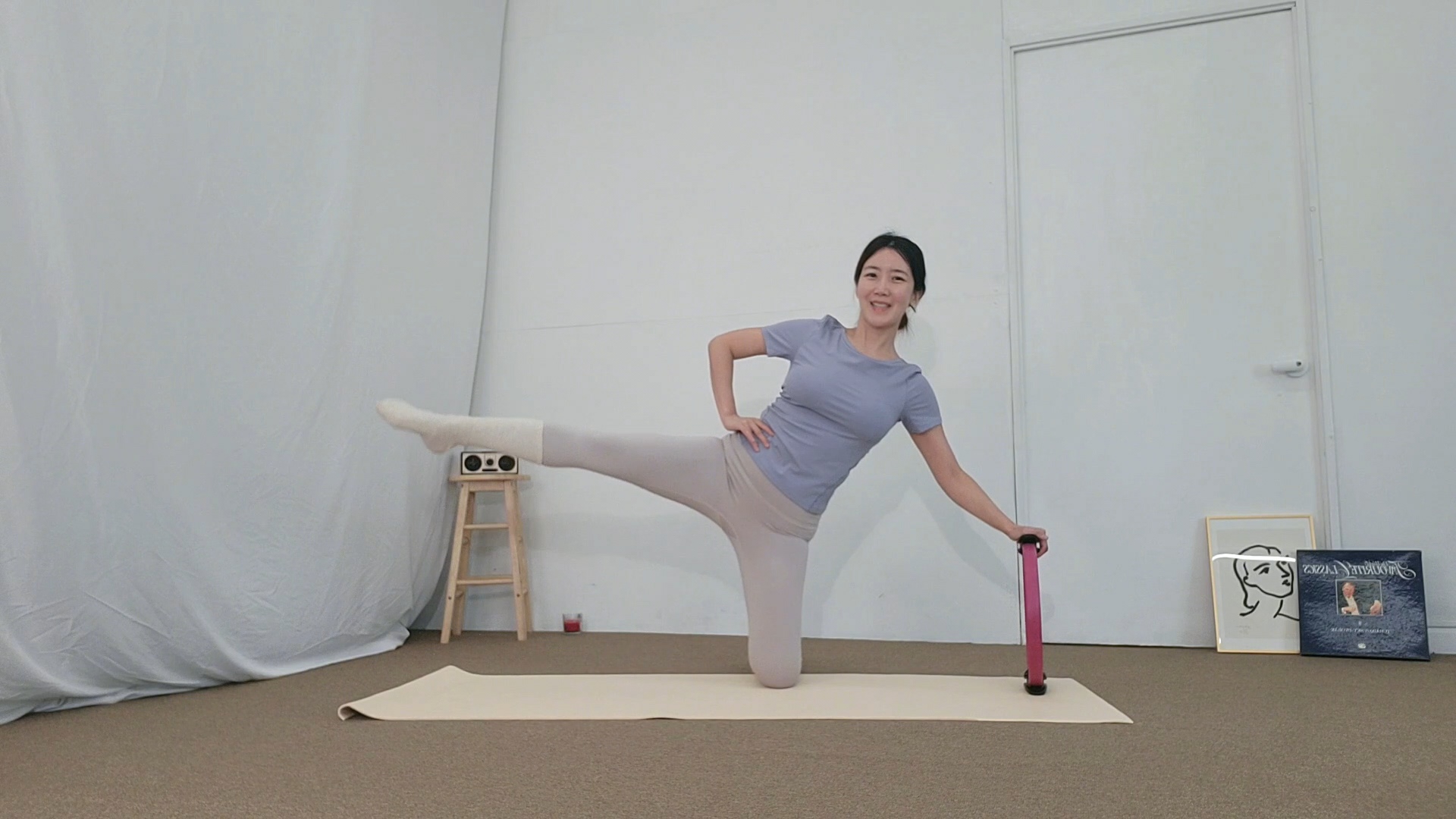 - 써클 내리는데, 어깨보다 멀리 두고. 반대손 허리 위. 중심 잡으세요. 다리 골반높이로 들어요. 발끝 긴 코인. 아래로 살짝 내렸다가, 차올려요.