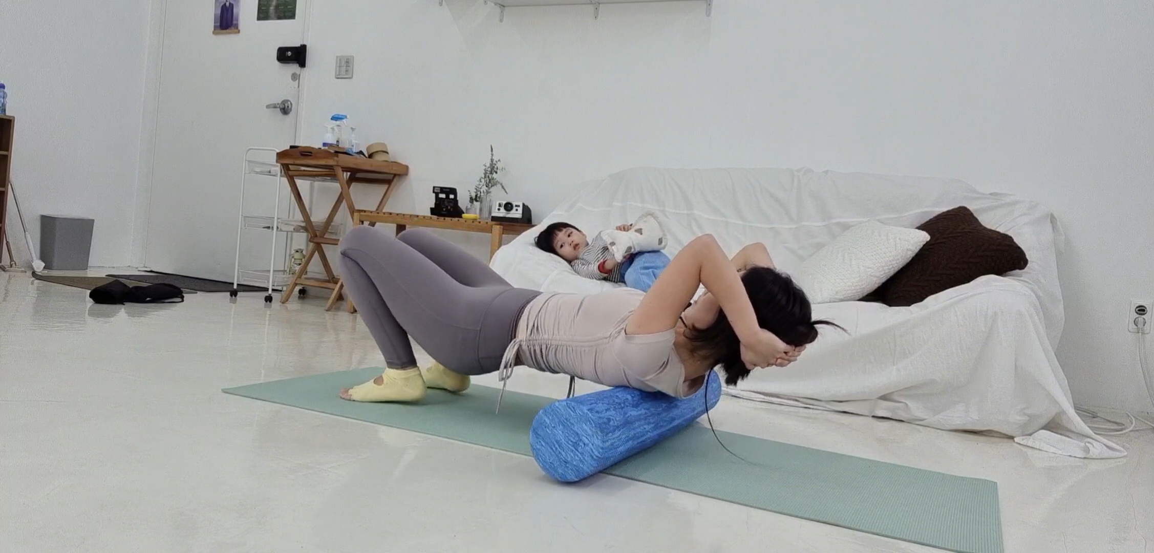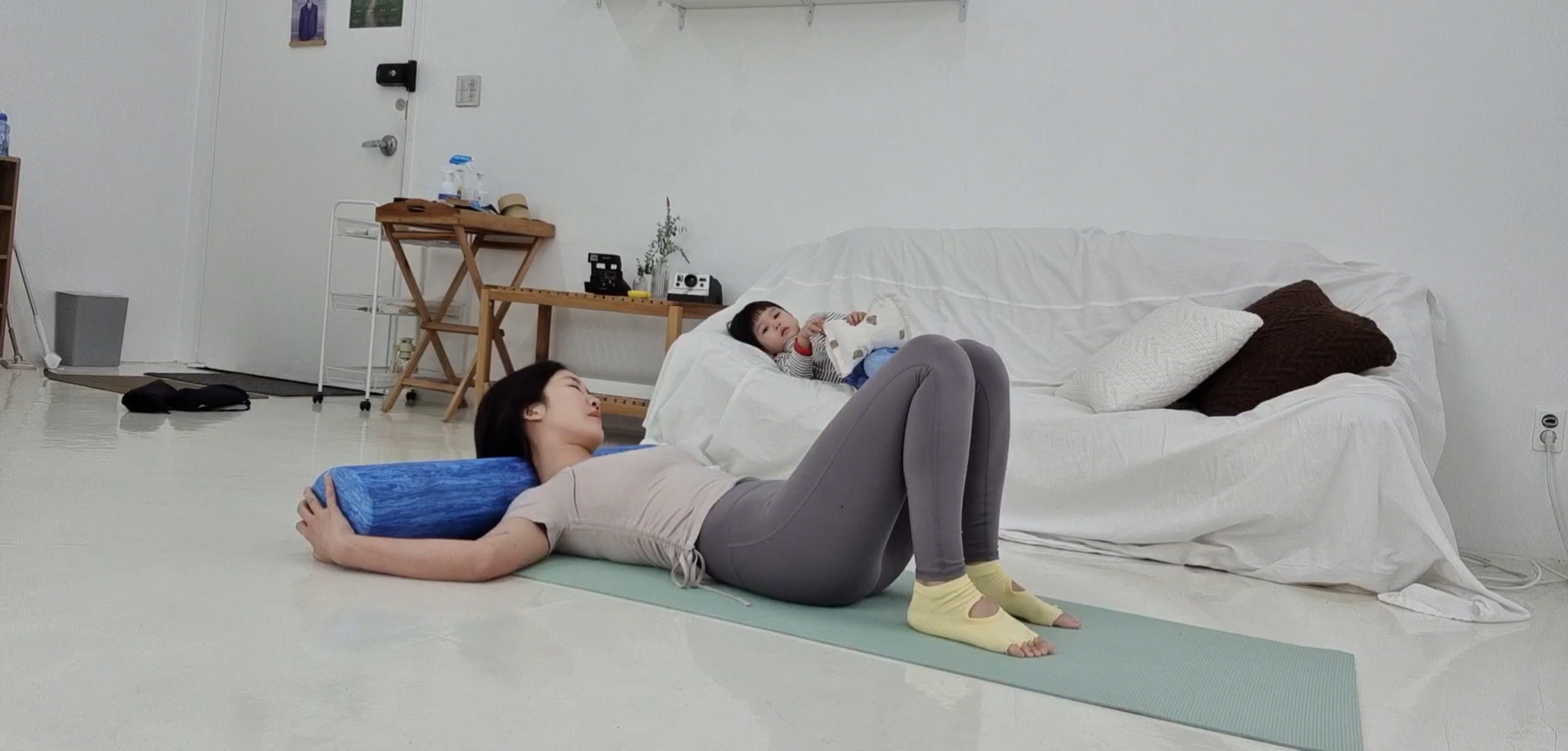 - 날개뼈 끝자락에 폼롤러 기대주고, 두 손으로 뒤통수 받쳐요. 엉덩이를 들어 폼롤러 굴리듯 마사지. 척추의 라인을 타고 기립근, 엉덩이 위까지 쭉 내려와 봅니다. 다리 조절하면서 뒷면을 시원하게 풀어보세요. 굽은 등, 타이트한 척추에 좋은 동작이에요. 한 가지 더 속이 더부룩하실 때에도 등 풀어주시면 소화돼요.