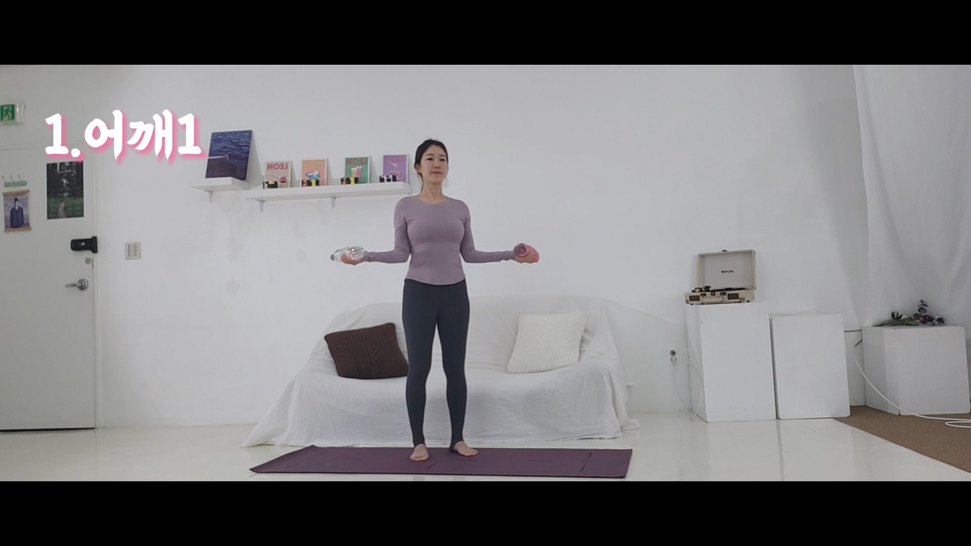 2. 어깨 2(생수병 2개) - 생수병 나눠 들고 차렷, 준비. 팔꿈치 안으로 접고, 이두. Y자로 뻗어냅니다. 어깨, 가슴 열어주세요. 제니처럼 예쁜 직각 어깨 만들어보아요.