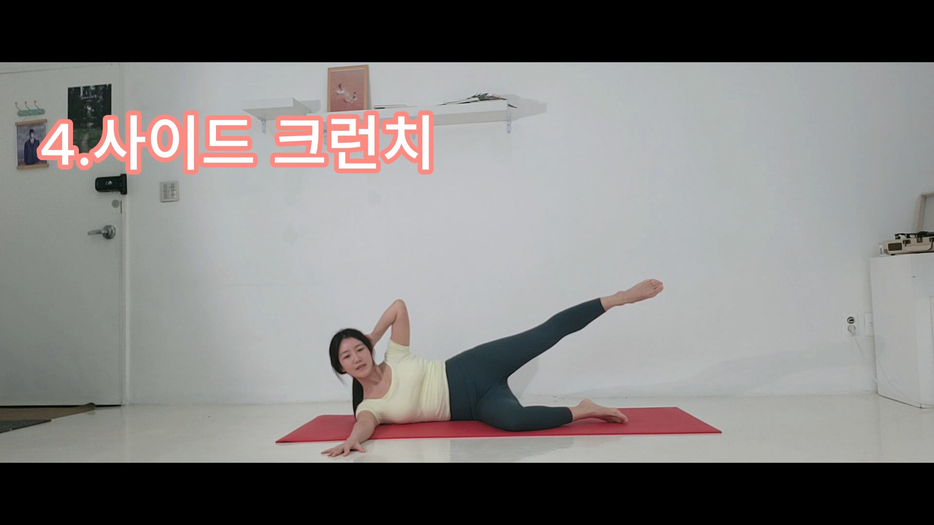 - 옆으로 누워 윗선 뒤통수에 기대고 밑에 다리를 접어 중심을 잡는다. 상체를 일으킬 때 윗다리도 뻗어 같이 들어 올린다.