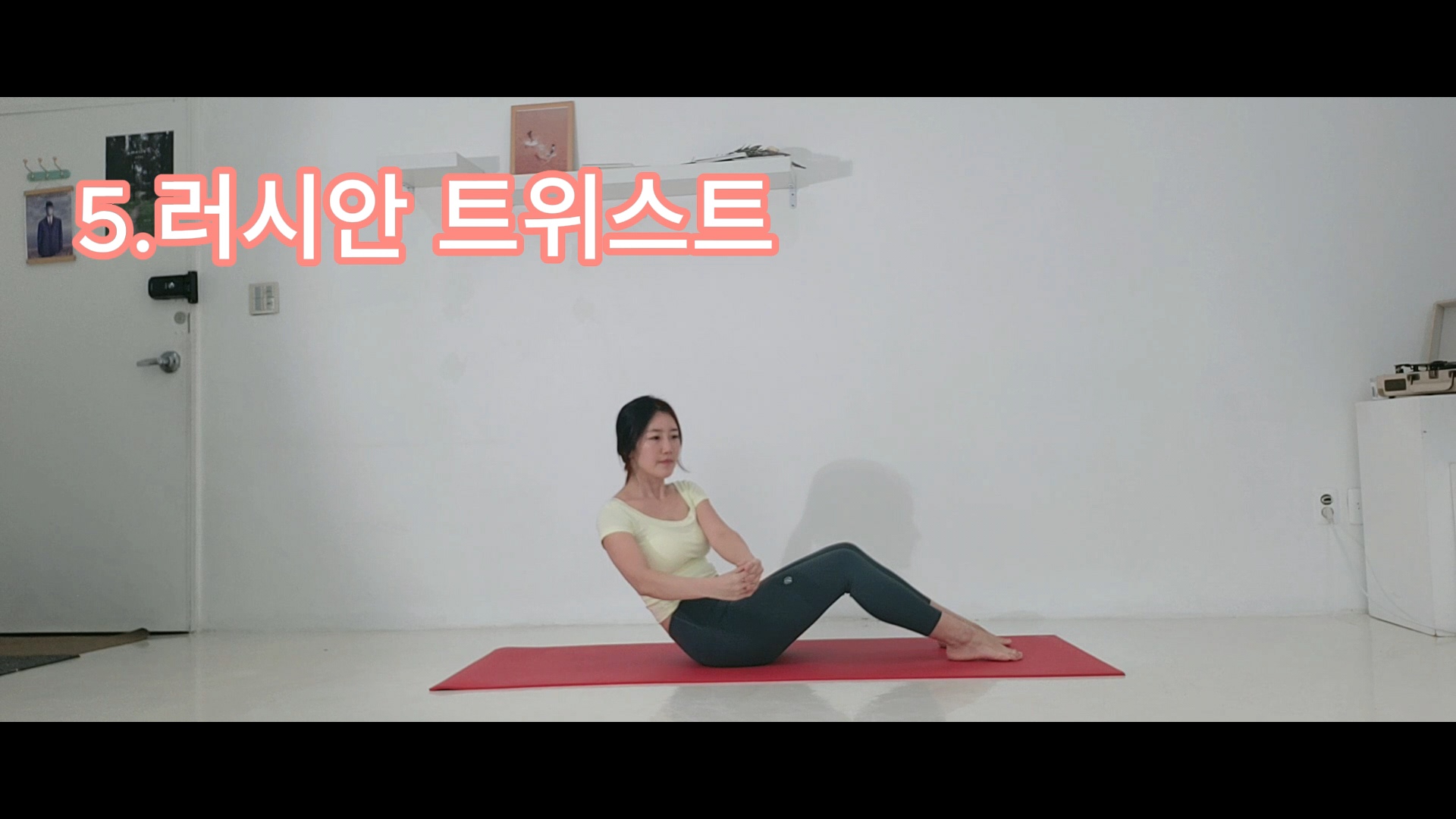 - 앉아서 산모양다리 멀리 세워두고, 골반을 뒤로 굴려 꼬리뼈 중심에 둔다. 두 손 앞으로 깍지 껴서 좌우로 몸통을 왔다 갔다 움직여 사이드 복부를 자극한다. 단! 골반이 움직이지 않도록 한다.