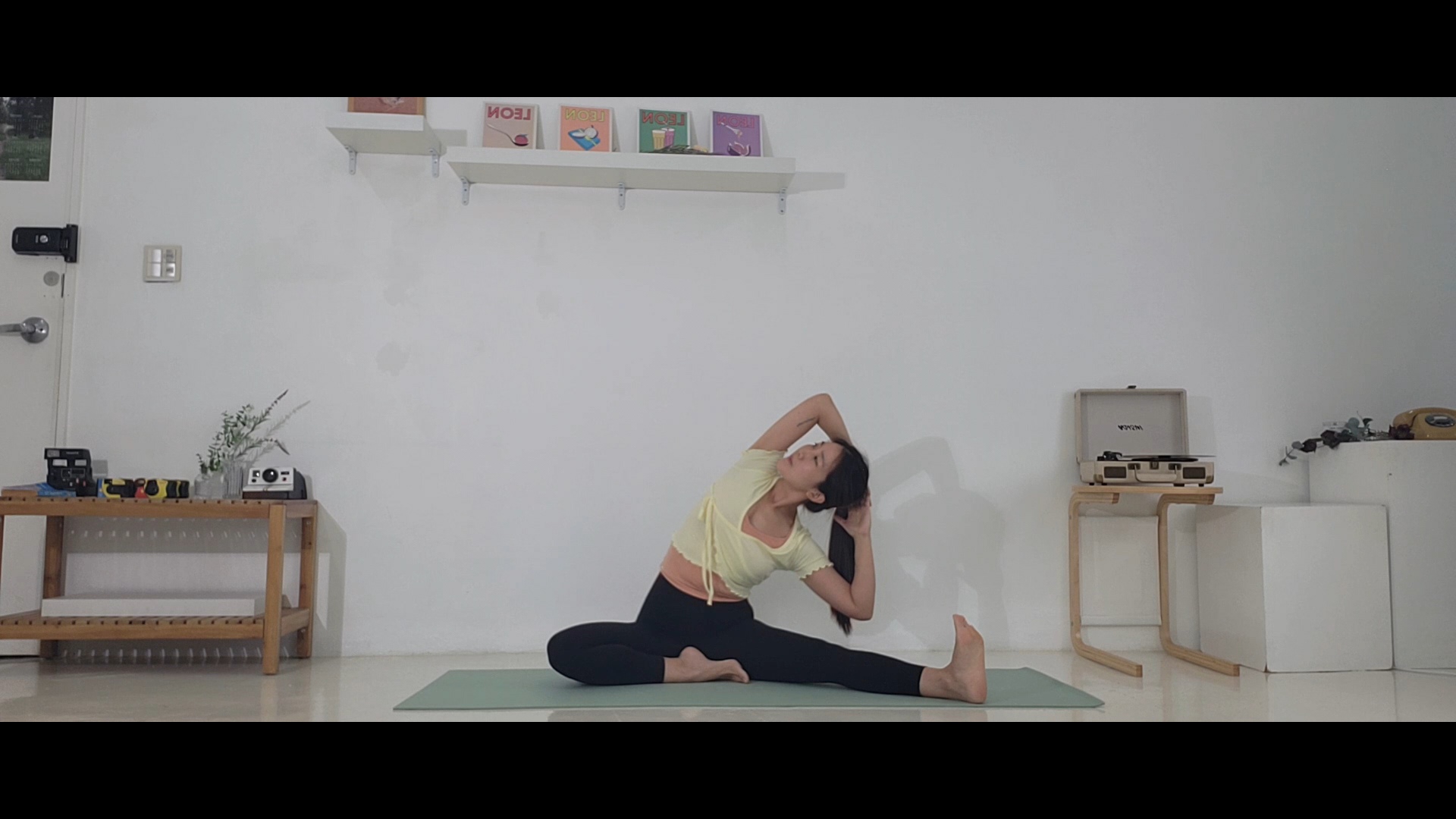반대팔 마셔요. 상체 위. 트위스트. 팔꿈치무릎 반대저항. 시선 사선 위 멀리 바라봅니다. 정면. 한번 더 상체 위로. 트위스트. 허리스트레칭. 앞쪽시선 돌아와요.(반대) 다리 펴주고, 반대발바닥 허벅지 안으로. 깍지껴요. 위로, 마시고 늘려줍니다. 목뒤긴장 완전히 풀어주고. 길어진 다리. 시선. 밀어서 라인업. 연결, 플랙스. 호흡. 늘러 줍니다. 다리안으로 상체는 더 무거워져요. 정면, 다리 올려서 스트레칭. 허리 말리면 스트레칭 안돼요. 긴 척추 지키고. 무릎 접어, 안아줍니다. 마시고, 발끝 더 위로. 한쪽 느낌 다를 수 있어요. 더 뻐근 한쪽 스트레칭 자주 해주세요. 멀어지고. 한번 더 후우. 골반이 시원해진 느낌. 내려놓고 반대팔. 마시고, 트위스트. 옆구리 조여냅니다. 정면 상체 위로, 한번 더 넘겨주고. 제자리 돌아옵니다.