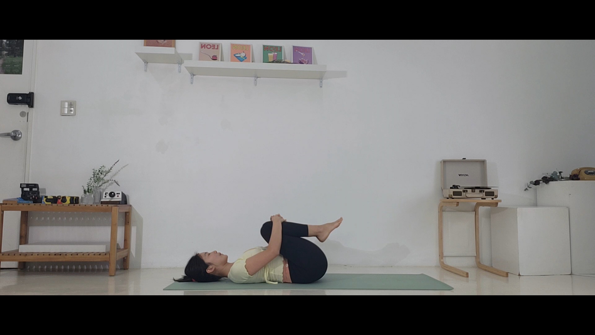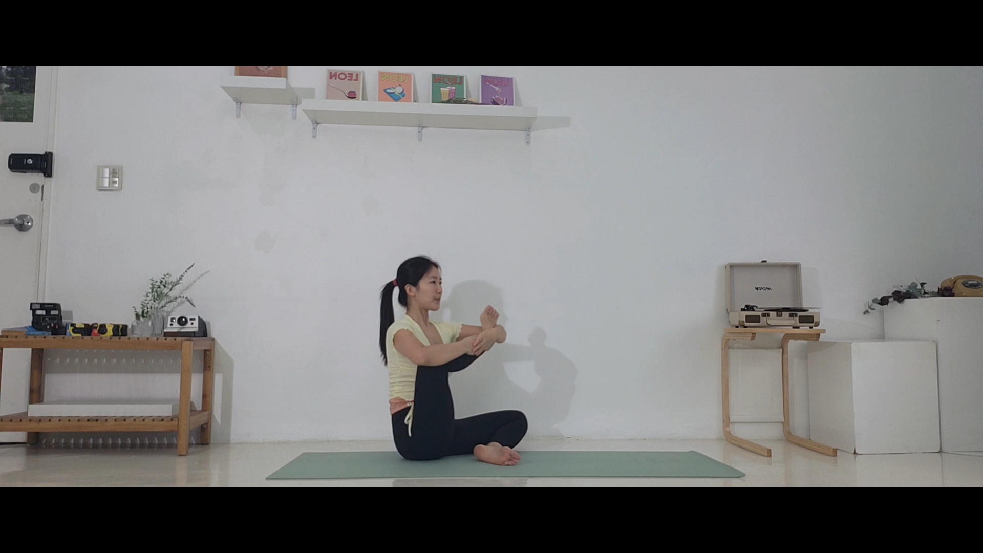 허리 일자로 길게 펴주고. 강한 스트레칭. 무릎 옆으로 접어 발옆선 팔꿈치 안으로. 반대팔다리 바깥쪽 안아주세요. 마셔요. 가슴 쪽으로 다리 끌어옵니다. 후우. 뒤꿈치가 내 가슴보다 쳐지면 안돼요. 골반스트레칭. 살짝 풀었다가, 한 번 더. 뻐근한 느낌 맞아요. 풀어주고,