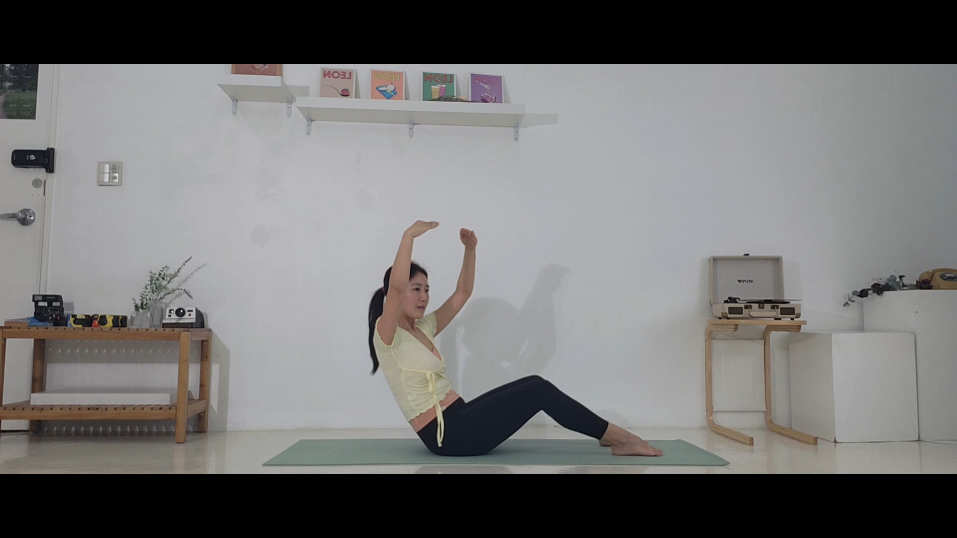 오늘 필라테스 센터 온 것처럼 상상하면서 호흡부터 차례대로 물 흐르듯, 즐겁게 운동해 봐요.