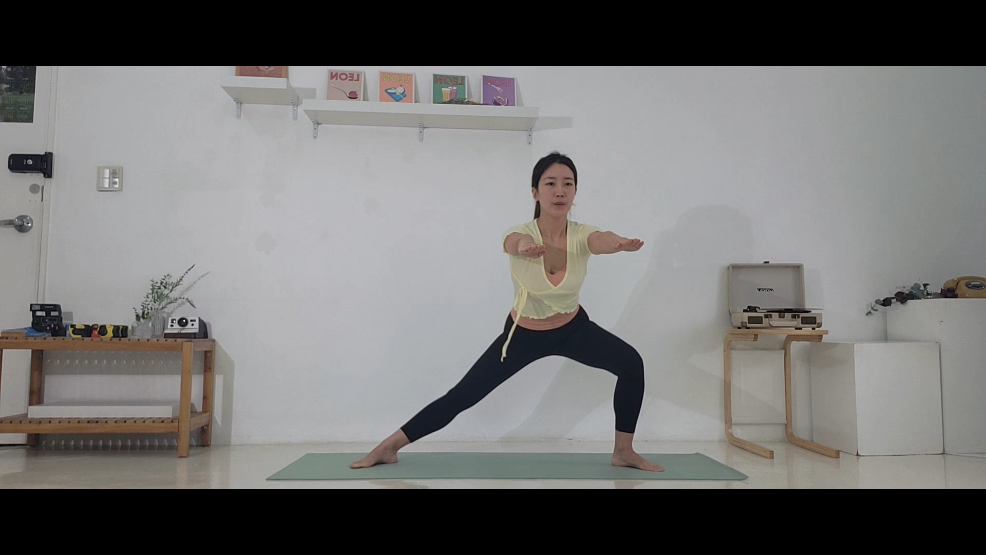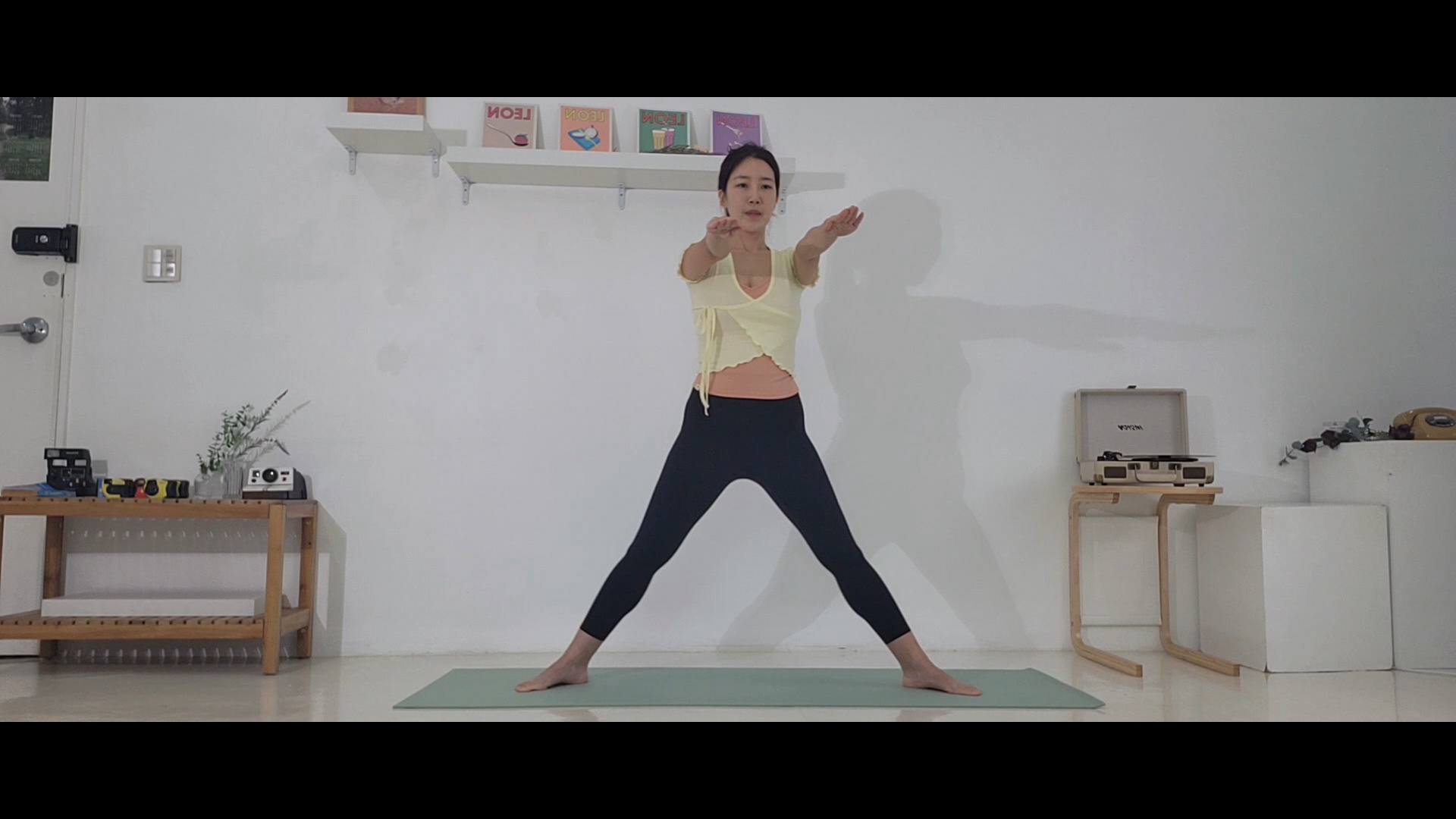 돌아오고. 이제 마시는 숨 윗 팔 옆구리안으로 퍼내고. 제자리. 5번. 골반 더 들어요. 윗팔 늘리고. 쭉쭉쭉. 천천히 제자리.