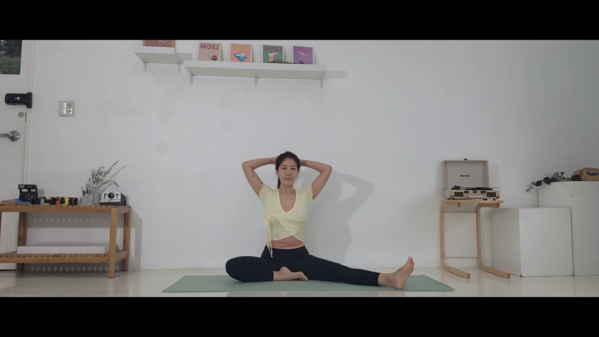 다리스트레칭. 한 다리 앞으로 반대발바닥 무릎 안으로 붙이고. 두 손 깍지 위. 마시고. 상체 길게 내려옵니다. 후우. 펴진 다리 같은 쪽가슴 허벅지 위에. 목뒤긴장 풀어내고. 정면. 밀어서 돌아와요. 플랙스발끝. 마셔요. 눌러줍니다. 무릎뒤 매트에 붙이고. 상체 다리안으로 더 깊어져요. 시선 앞.
