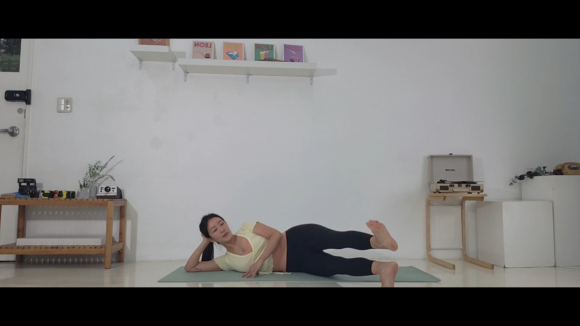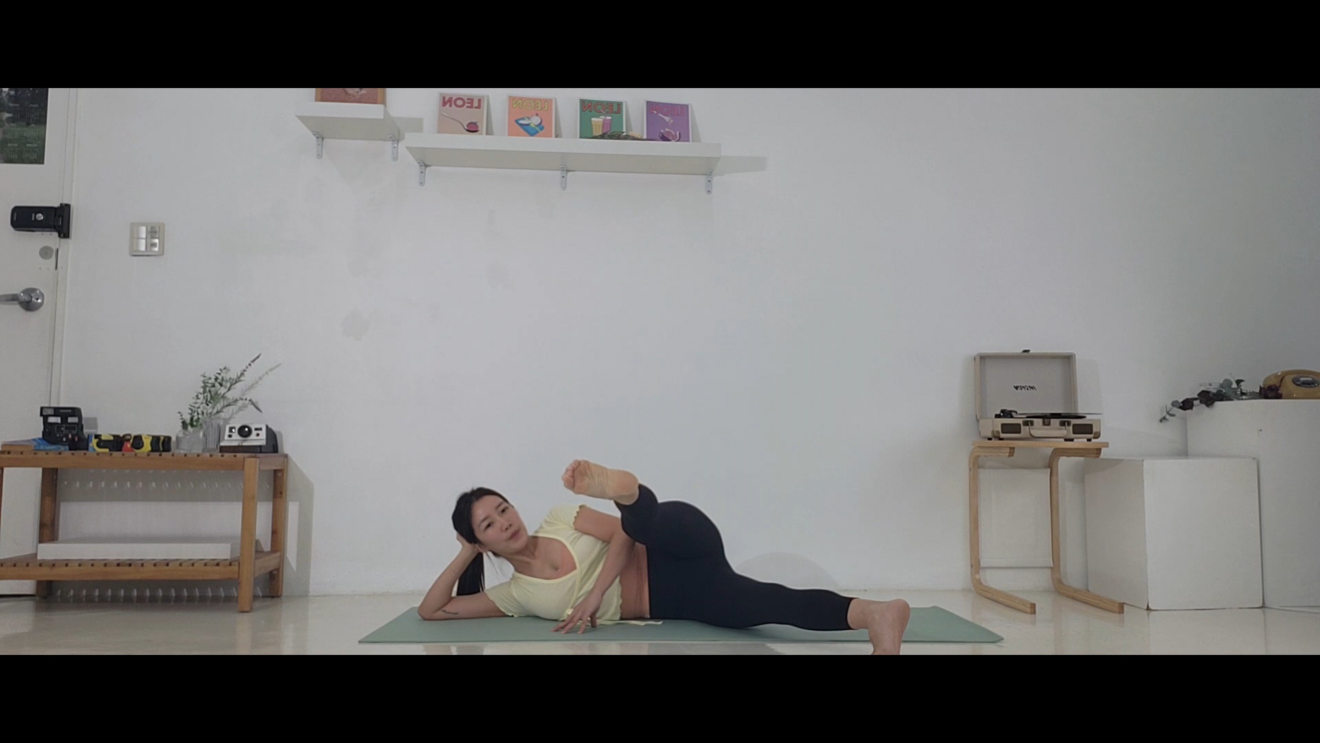 옆으로 누워주세요. 손으로 머리 받쳐 전신 일자로 만든 후, 윗선 가슴 앞 지탱해 줍니다. 상체는 고정. 두 다리 다리만 앞으로 꺼내, 사선에 놓아주고. 두발 플랙스. 발모양 만들고 가요. 밑에 다리 발가락 매트에 찍어주고. 위에 발 뒤꿈치 붙인 상태 발끝 천장으로 열었어요. 준비자세.