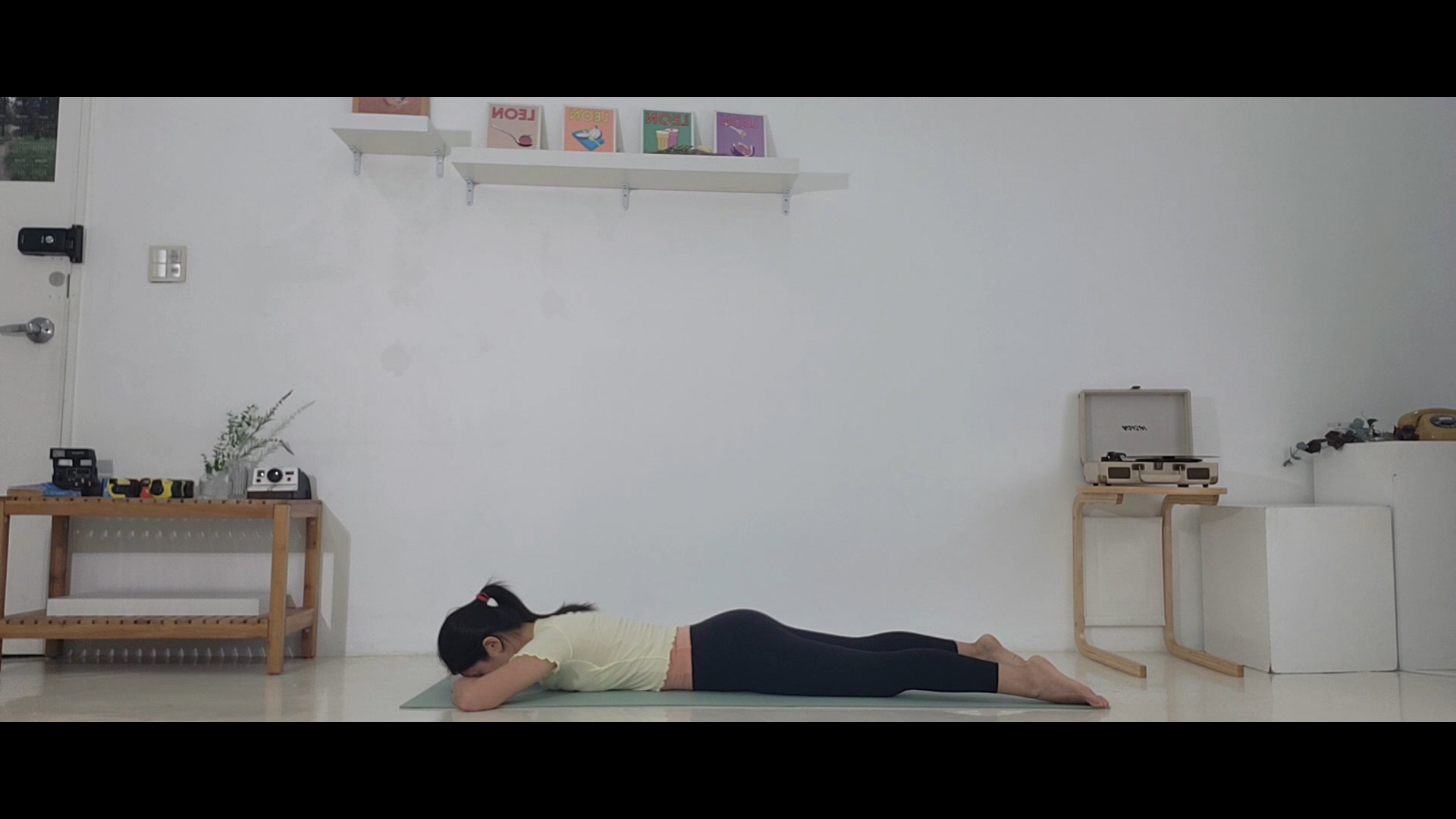 두 손 포개 이마기대주고, 두 다리 매트넓이만큼 열어 준비합니다. 상체고정. 두발끝 긴 코인. 기립근힘 유지하면서, 두다리 공중 들어요.