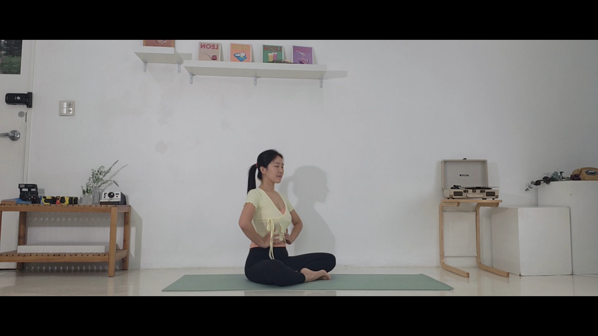 자리에 편하게 앉습니다. 두 손 갈비뼈위에 눈감고, 필라테스 호흡합니다. 천천히 코로마시는숨에 갈비뼈는 옆으로 넓게 늘어나고. 입으로 길게 밷어냅니다. 갈비뼈닫아 복부를 위로 끌어올리고, 한번더 코로마셔요. 입으로 후우. 어깨는 떨어뜨리고 척추는 위로 길어져요. 마지막 큰호흡주세요. 입으로길게. 갈비뼈열고닫는흉식호흡으로 반복해주셨어요.