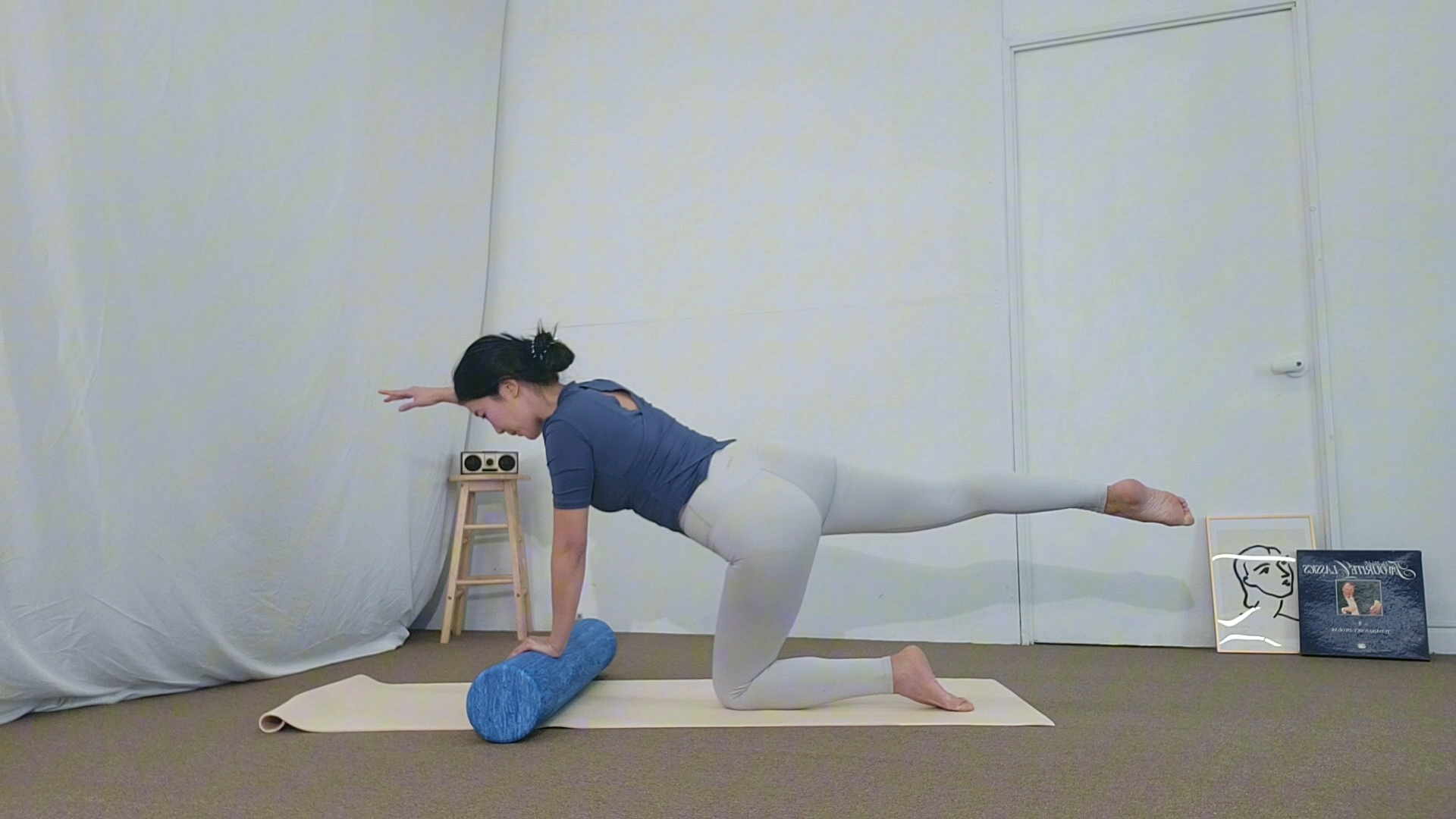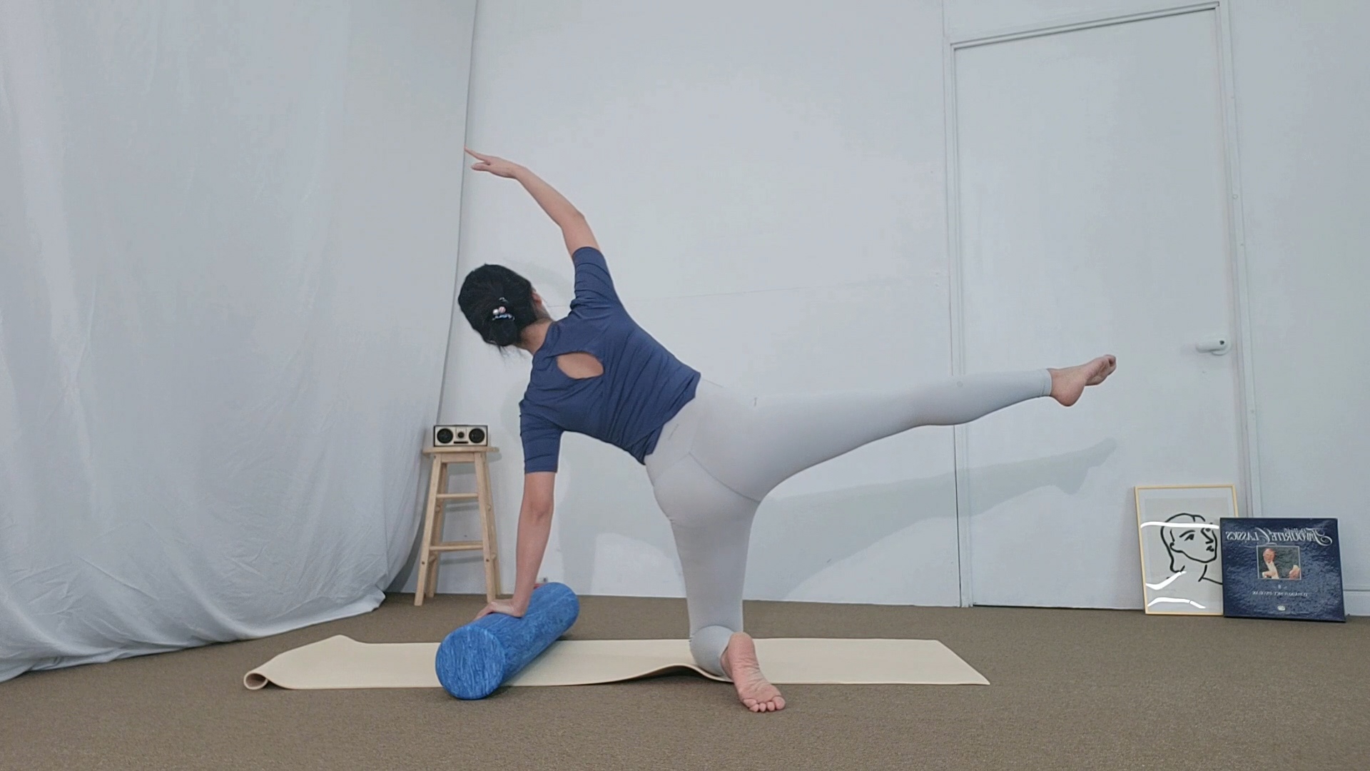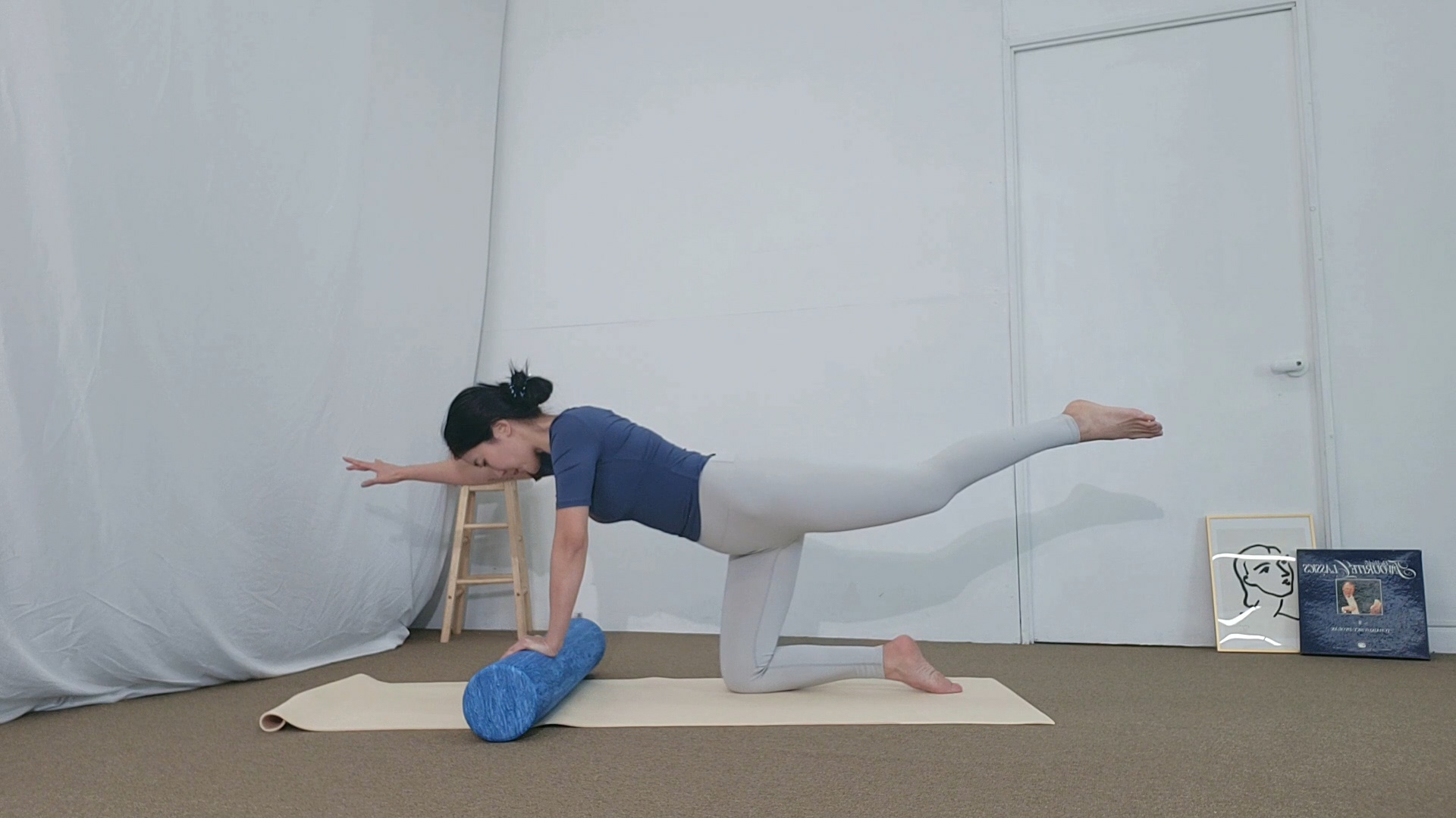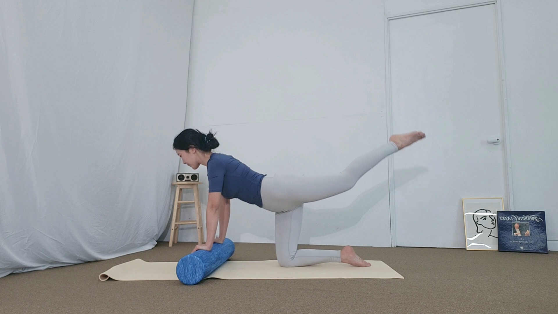 - 폼롤러위 ㄷ자몸. 한다리 뒤로, 이제 같은 손 새끼손 폼롤러에, 발란스부터 시작. 팔, 다리 공중. 기다리고. 중심 잡혔다 싶을 때 옆쪽 보세요. 상체와 골반을 앞으로 꺼내고. 정면. 윗다리 매트 위 잠시 내릴 때, 지탱하는 어깨 길게 눌러내요. 준비. 윗다리 골반높이 킥.