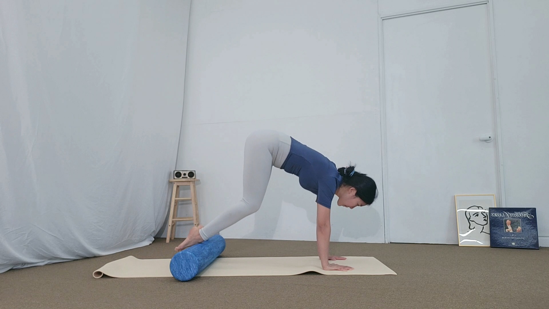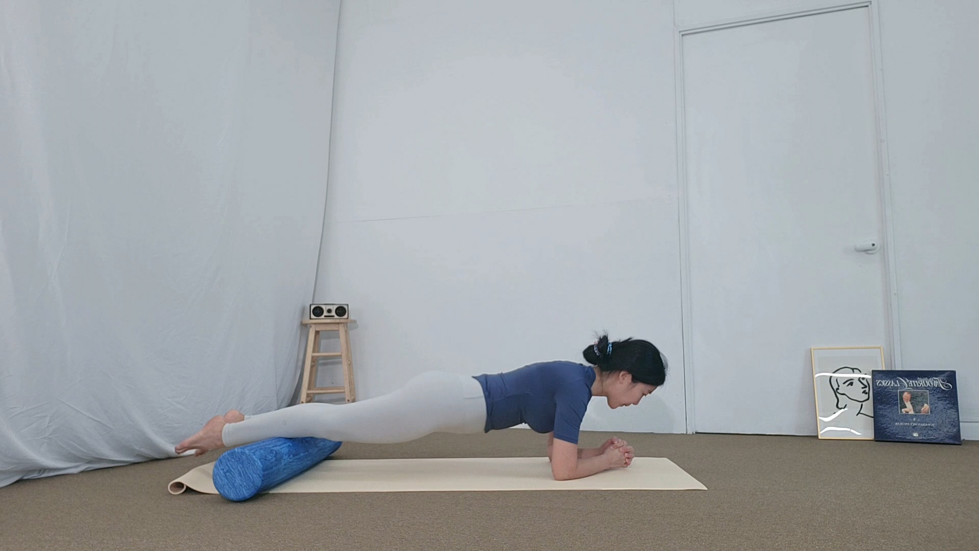 - 폼롤러에 발목 얹고, ㄷ자몸, 팔꿈치 내려 깍지 끼고, 어깨 지탱 합니다. 호흡준비. 마시고, 다리 쭉. 플랭크. 버팁니다. 폼롤러 굴러가려는 성질 때문에 동작 난이도 높아져요. 힌들리지 않게 일자.