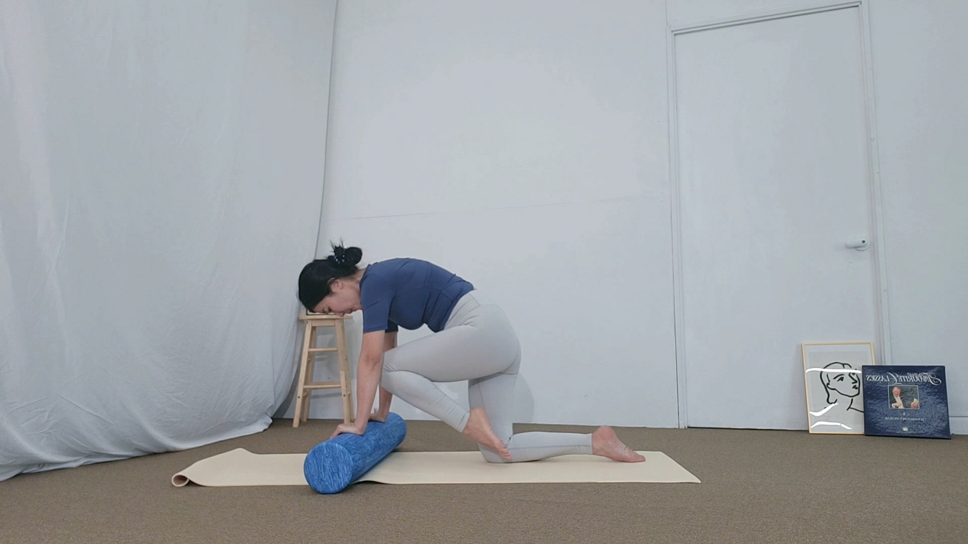 - 무릎세운 상태 그대로, 한 다리 뒤꿈치를 폼롤러 위에 얹어 놓습니다. 두 손 허리 위로 준비. 호흡 마시고, 다리힘 폼롤러 옆으로 밀어냈다가, 허벅지안쪽 스트레칭. 마시고 안쪽 근육 잡아, 천천히 폼롤러 끌고 와요. 중요한 건 다리 많이 찢는 것보다 엉덩이 뒤로 빠지지 않는 거. 한 번 더, 마시고, 다리 쭉. 골반, 허벅지안쪽 쌓여있는 노폐물 정리해 주고, 천천히 조여옵니다. 안쪽으로 당겨오실 때가 더 신중하게. 그때 근육 쓰이는 거예요.